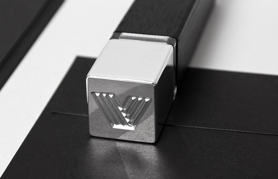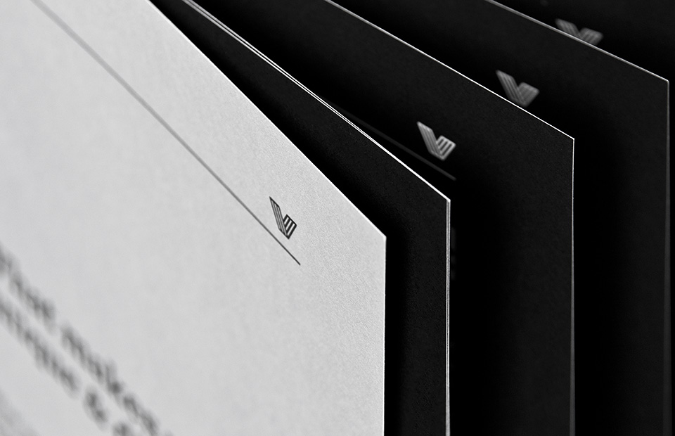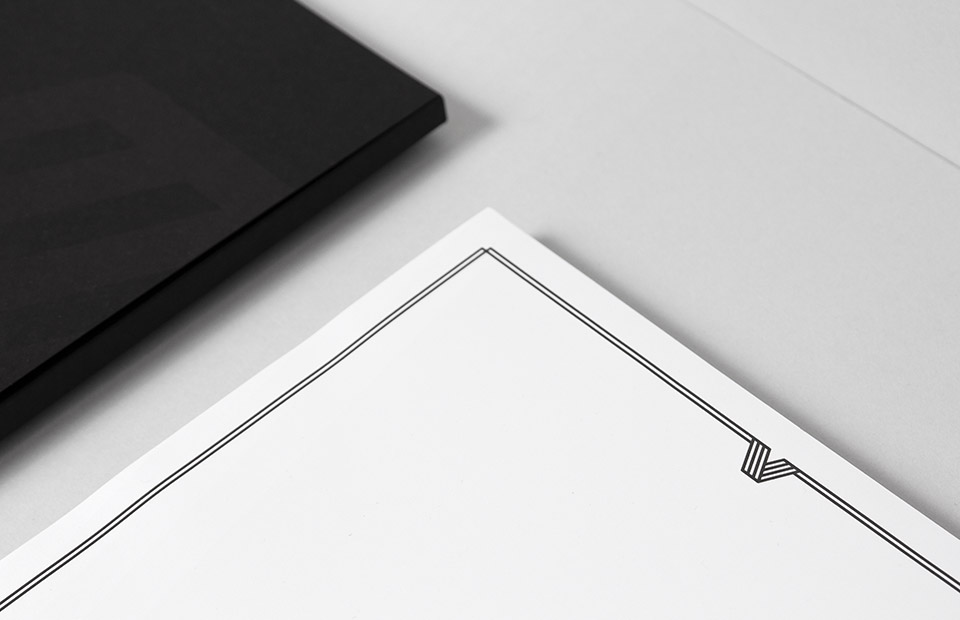 For stationary our choice was a combination of smooth white paper + high quality tinted black paper finished with black overprint and silver hot-stamping technique.